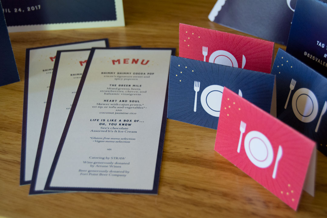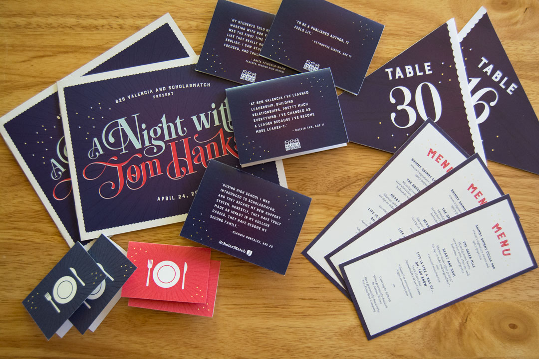 826 Valencia & ScholarMatch Fundraising Event: 826 Valencia teamed up with local nonprofit, ScholarMatch in order to raise funds for educational programs and scholarships that will serve under-resourced youth in San Francisco. The event featured celebrity guest, Tom Hanks. Under the creative direction of Meghan Ryan, I designed several collateral pieces for the event including signage, table numbers, menus, registration tents, meal cards, tents featuring quotes from students, and the program's slideshow presentation.