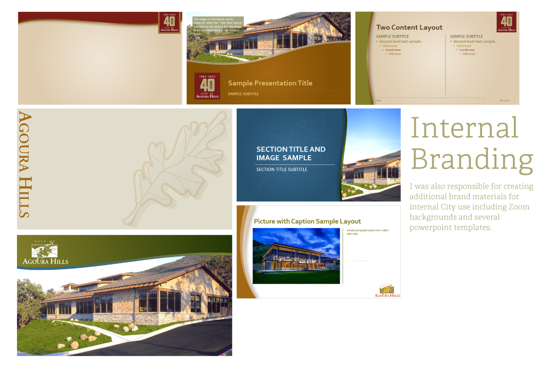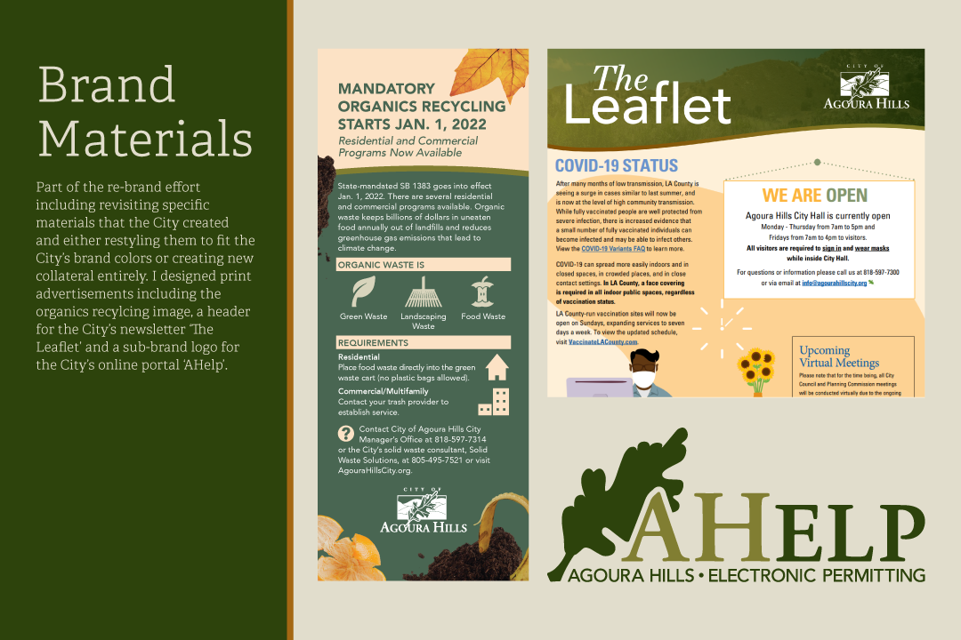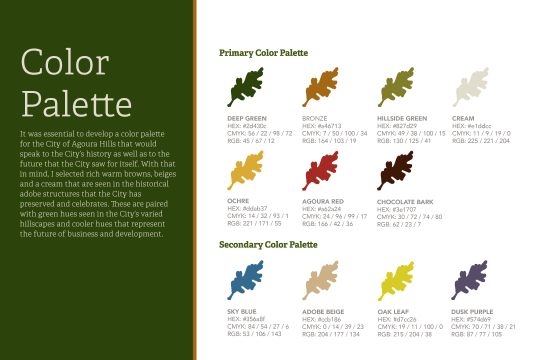 City of Agoura Hills Branding: The objective of this project was to create a brand identity for the City of Agoura Hills that honored its historical roots as well as laid out a vision for the City's future. With that in mind, I selected warm colors such as browns and creams that are seen in the preserved adobe structures that the City celebrates. These are paired with greens seen in the City's scenic hillscapes and cooler hues representing the future of business and development.