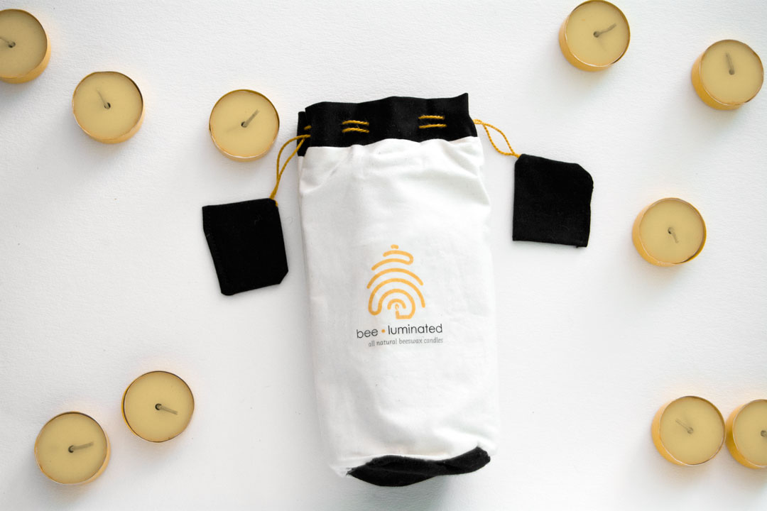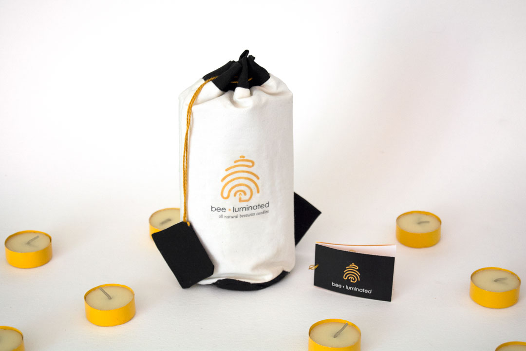 SOLUTION: There was an evident need to eliminate the large amount of plastic that is currently being used to package tea candles. An organic reusable cotton pouch with a cardboard hard-shell interior protects the contents while regulating the internal temperature to prevent the candles from melting. The shell of the pancake tortoise–which is strong yet flexible allowing it to wedge into small spaces–inspired the hard shell interior of Bee Luminated packaging.