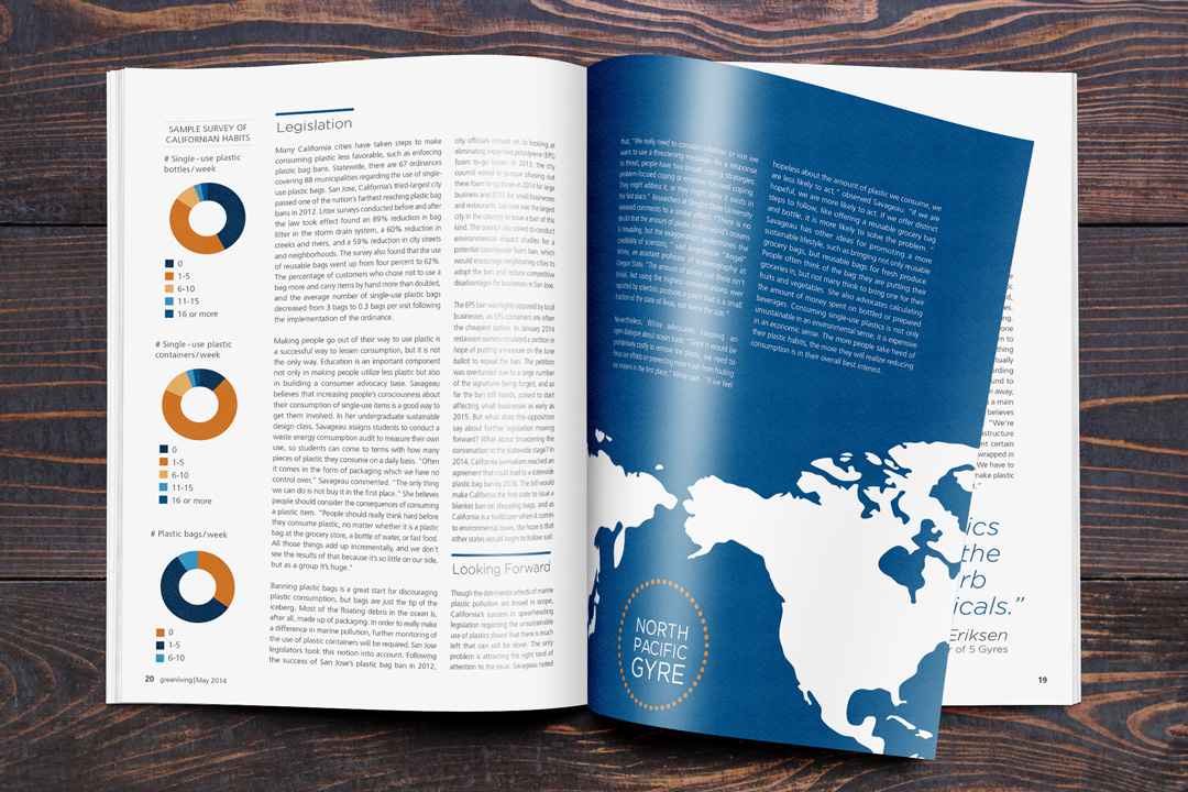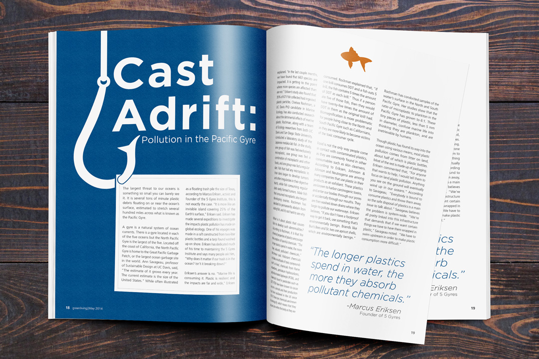 SOLUTION: Promotional items spread awareness about replacing everyday plastic items with eco-friendly alternatives. An editorial for Greenliving magazine spreads awareness about the Pacific Gyre and the dangers of plastic pollution. The website and billboard bring the campaign to a mass audience.