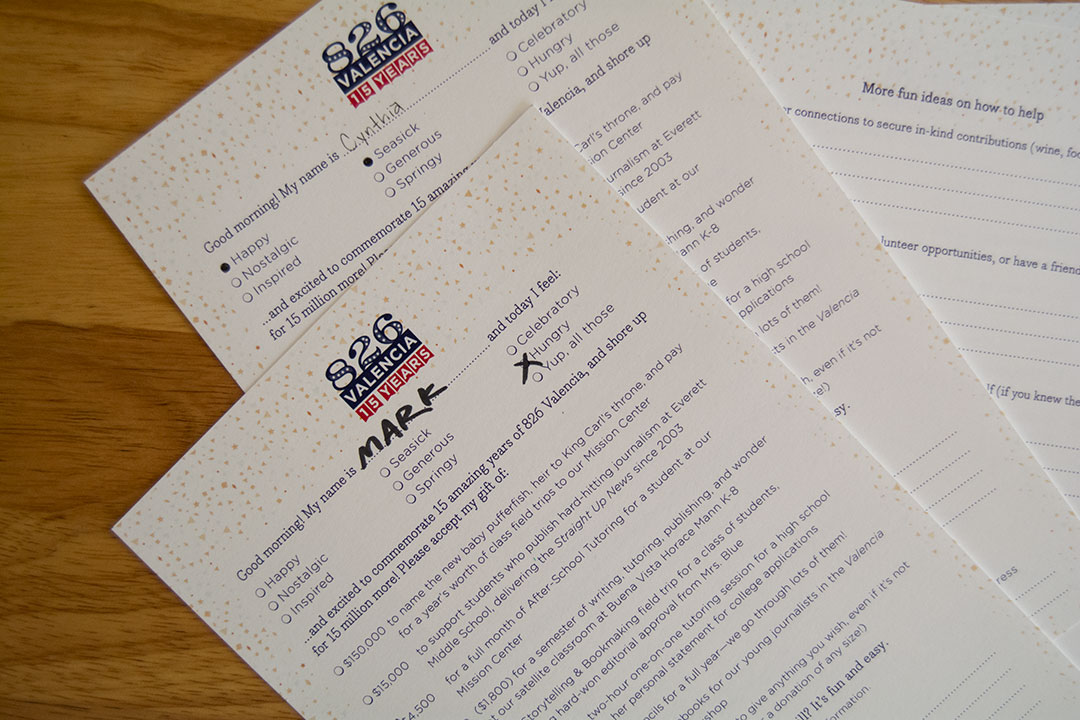 Fifteenth Anniversary 826 Valencia is an educational nonprofit that provides writing programs and workshops to under-resourced students in San Francisco. In celebration of their 15th anniversary, 826 released several anniversary celebration themed items. Under the creative direction of Meghan Ryan, I created anniversary-branded materials including street banners, posters, event collateral, and an anniversary logo that is used on all 2017 publications as well as 826 letterhead.