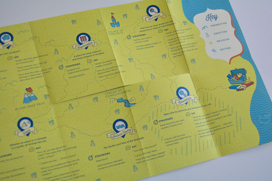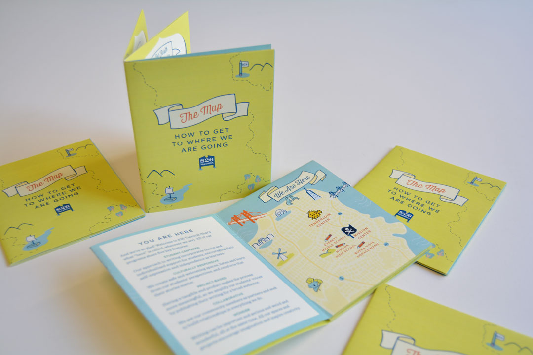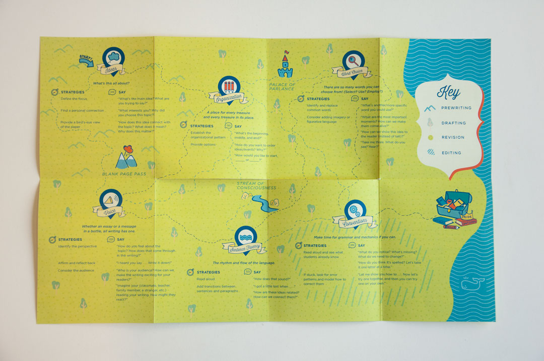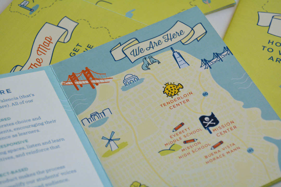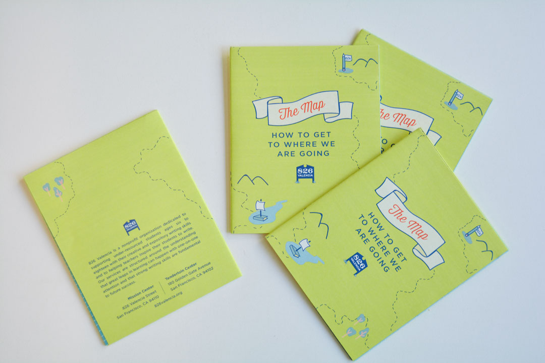 The Map 826 Valencia is a nonprofit that offers writing workshops to children in under-served communities. The organization realized a need for an informational tool that could provide teachers and tutors with a guide to 826 Valencia's tutoring approach and values. They also wanted something that could function as a guide for tutors and children to work with as the child develops their piece of writing. In response to these needs I designed "The Map", a comprehensive piece that introduces 826 Valencia's core message in the form of a booklet. When opened, the reverse side mimics a treasure map, guiding children through important stages in the writing process. The design for this piece was inspired by 826 Valencia's nautical and exploratory themed spaces in San Francisco.