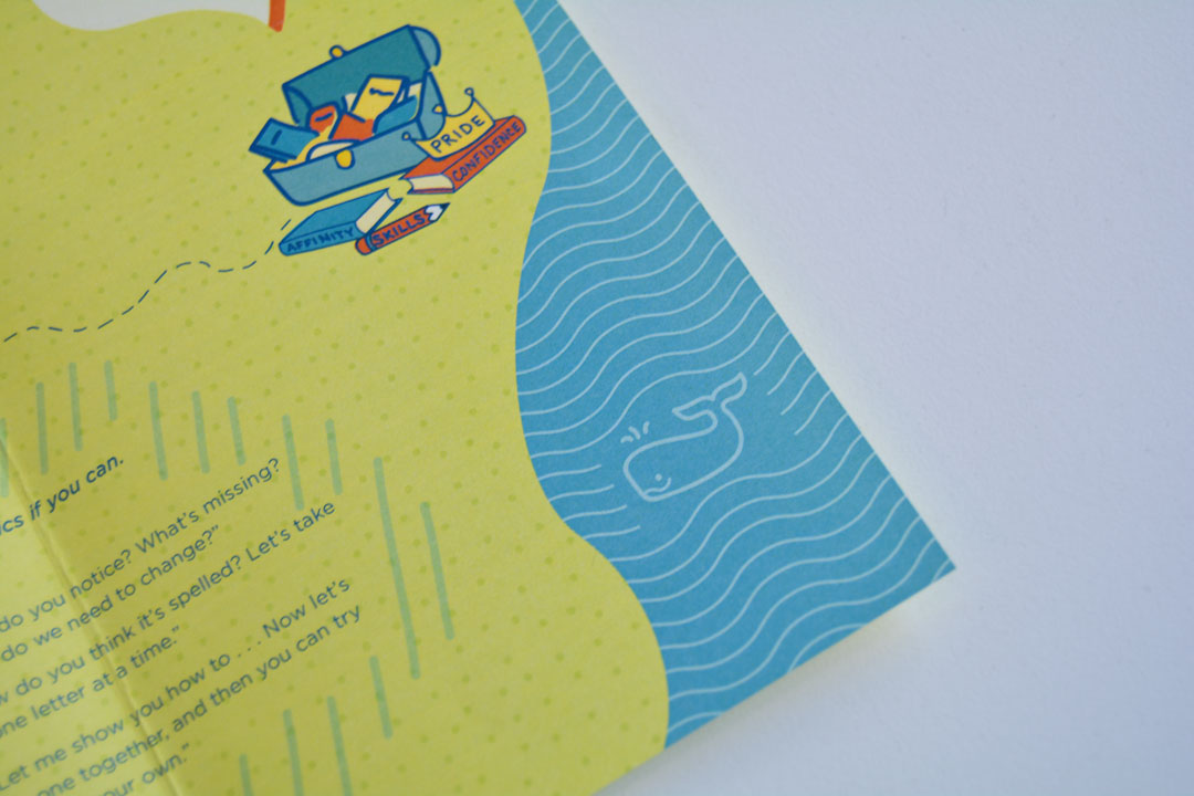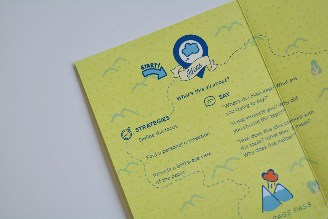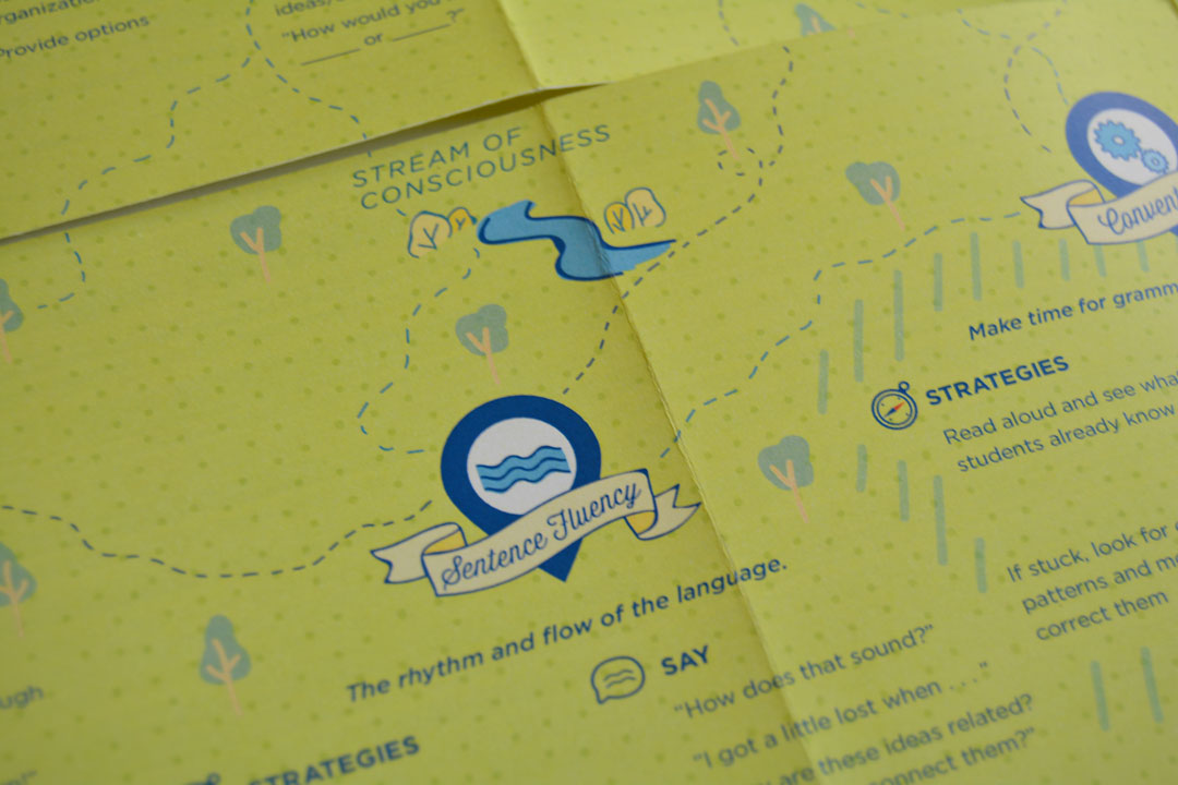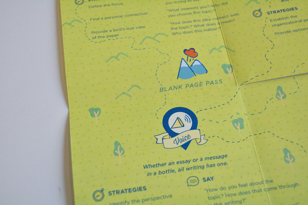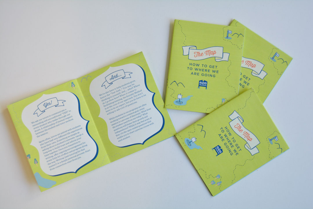 The Map 826 Valencia is a nonprofit that offers writing workshops to children in under-served communities. The organization realized a need for an informational tool that could provide teachers and tutors with a guide to 826 Valencia's tutoring approach and values. They also wanted something that could function as a guide for tutors and children to work with as the child develops their piece of writing. In response to these needs I designed "The Map", a comprehensive piece that introduces 826 Valencia's core message in the form of a booklet. When opened, the reverse side mimics a treasure map, guiding children through important stages in the writing process. The design for this piece was inspired by 826 Valencia's nautical and exploratory themed spaces in San Francisco.