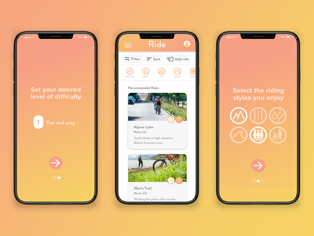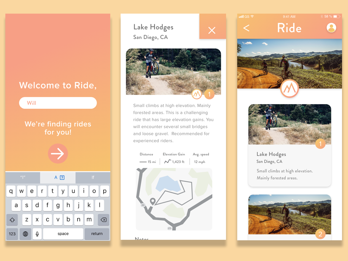 Ride is a mobile app created to help cyclists find bike routes in their community. The concept for the design was to combine clean design with approachable illustrations and imagery in order to encourage riders of all experience levels to feel comfortable on the app and on their bikes.
